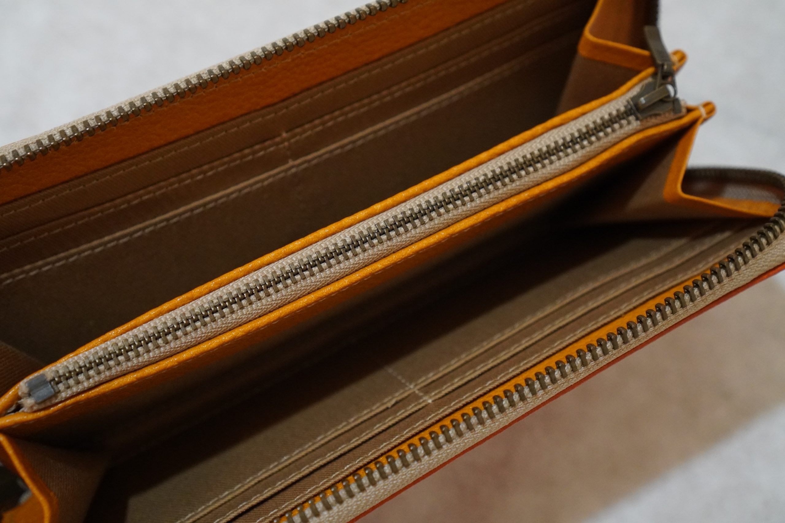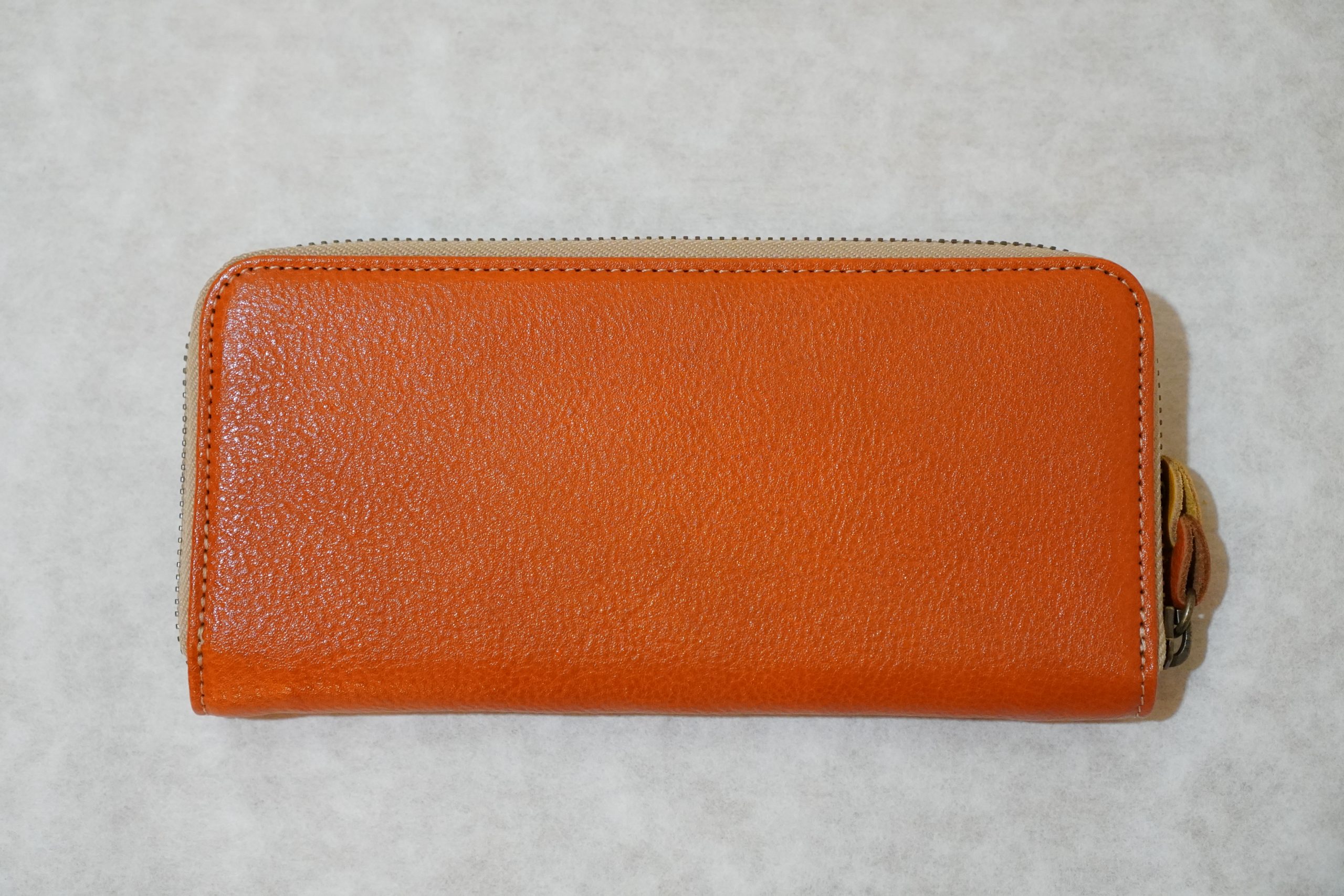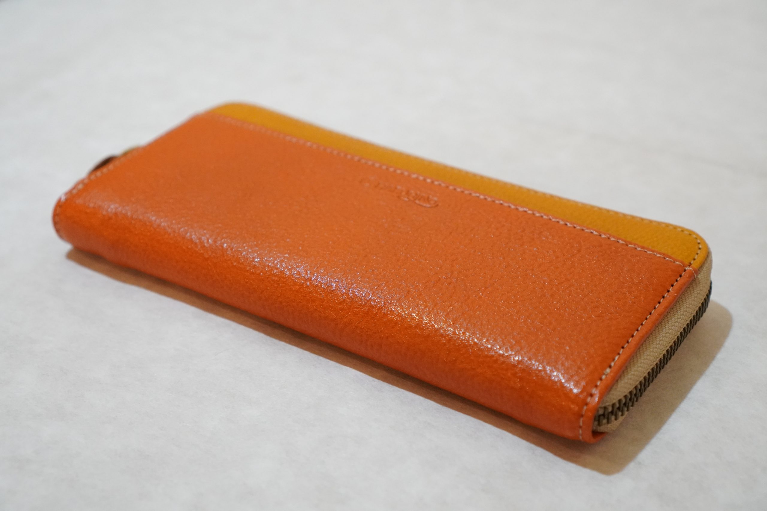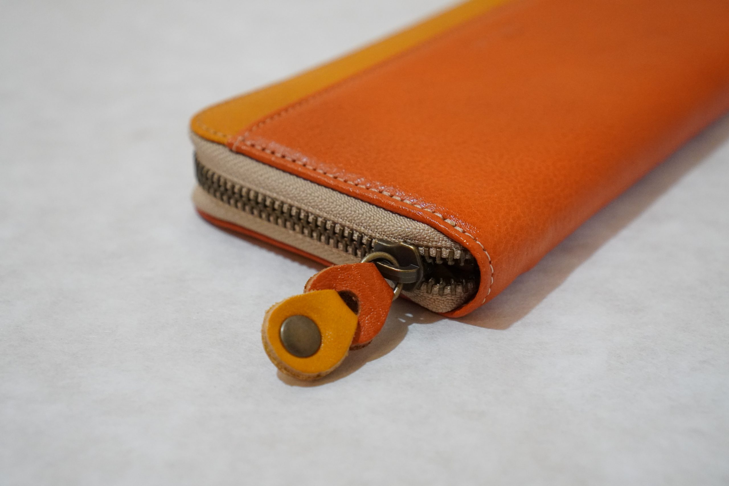 バイカラーのヌメ革財布ラウンドファスナー(オレンジ/イエロー)〈3営業日以内発送〉