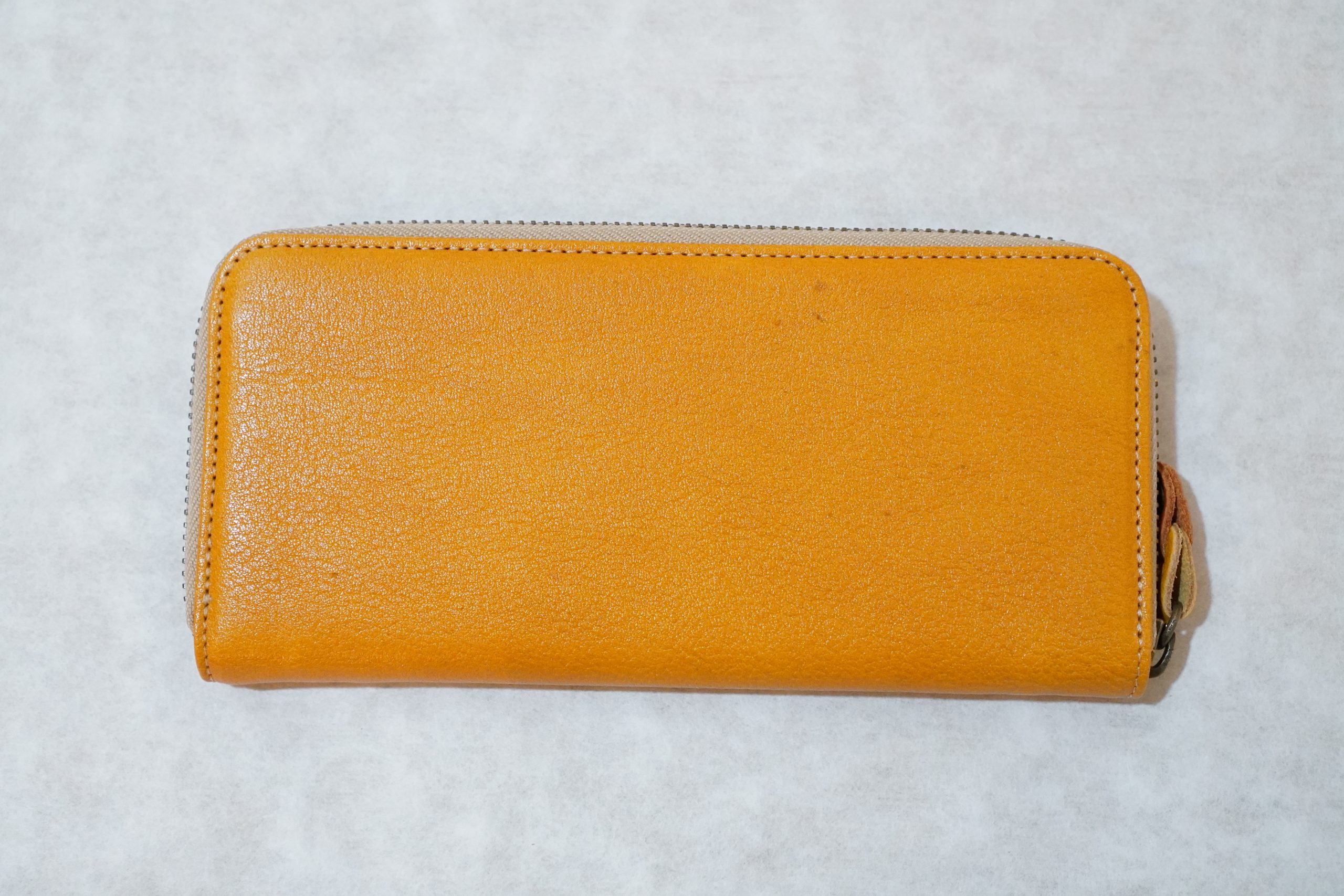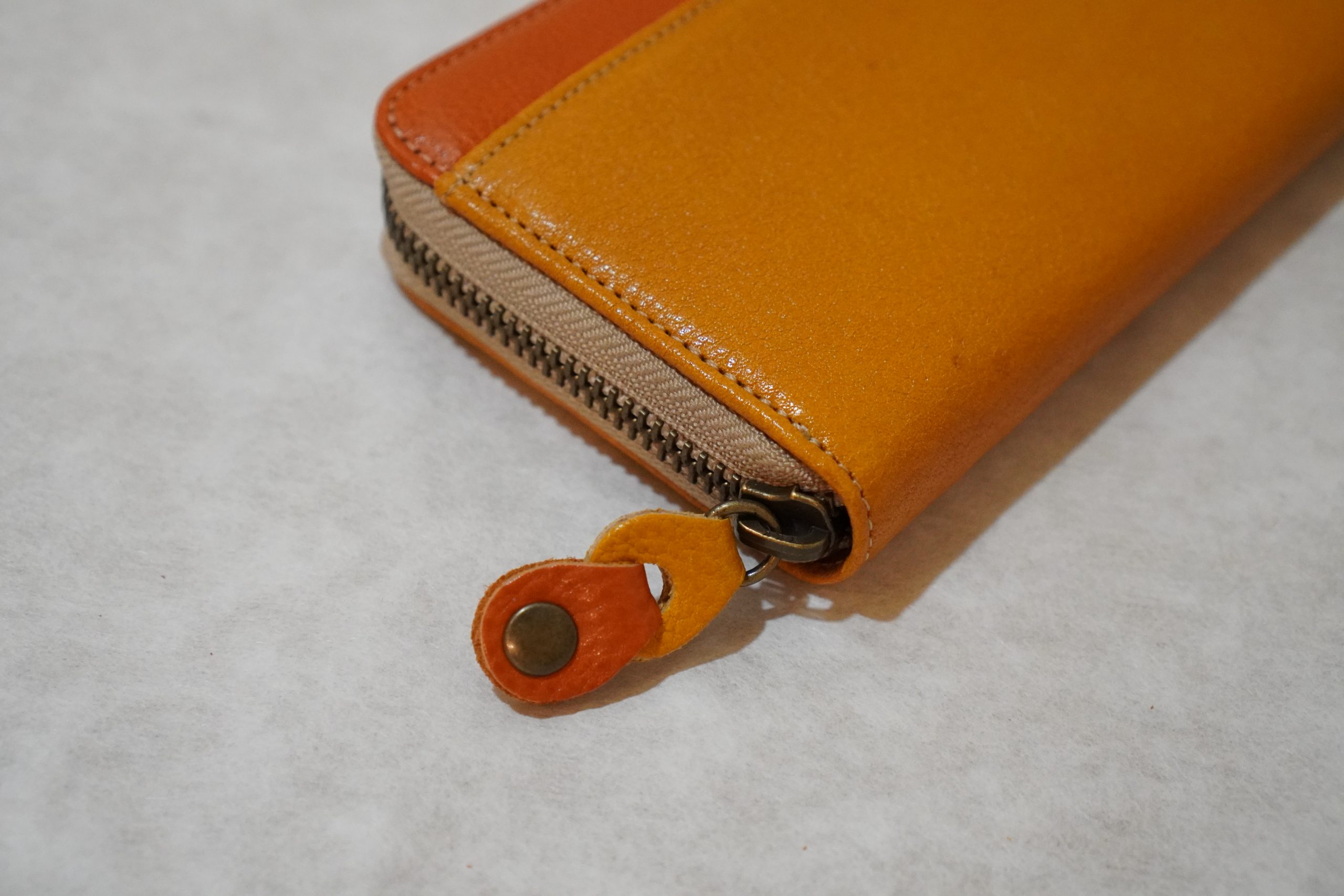 バイカラーのヌメ革財布ラウンドファスナー(イエロー/オレンジ)〈3営業日以内発送〉